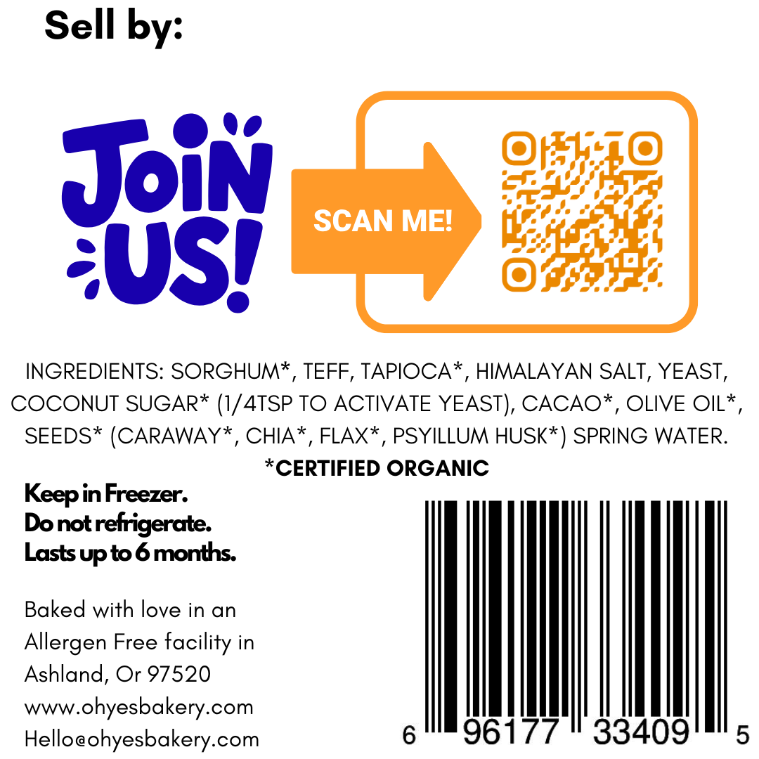 Teff, Tapioca Starch*, Cacao Powder*, Caraway seeds*, Chia seeds*, Molasses*, Flax seeds*, Olive Oil*, Pink Himalayan Salt, Psyllium Husks*, Spring water.